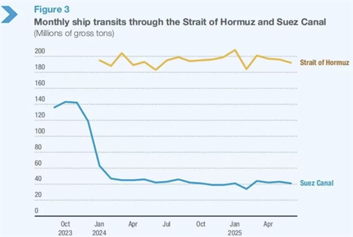 截至2025年5月,過境蘇伊士運河的船舶流量比2023年減少約70%,大量船舶被迫改道好望角。2024年全球平均單航程里程增至5,245海里,高于2018年的4,831海里。