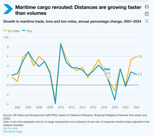 在去年實現強勁增長后,海運貿易于2025年陷入停滯,運量僅增長0.5%。地緣政治緊張迫使長途航線調整,去年以噸海里計的運輸量因此大幅攀升,增長率接近6%。