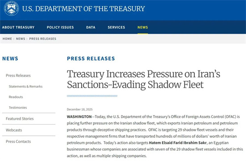 12月18日,美國財政部外國資產控制辦公室(OFAC)宣布,對參與伊朗石油及成品油運輸的“影子船隊”采取新一輪制裁行動,涉及29艘船舶及其背后的船舶管理和運營公司。