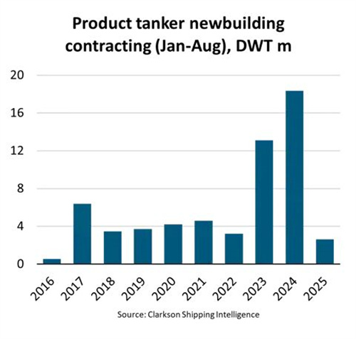 今年1月至8月,成品油油輪新造訂單同比下降86%至260萬載重噸(DWT),創(chuàng)下九年新低。