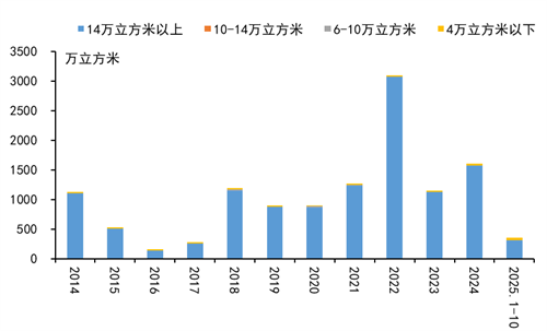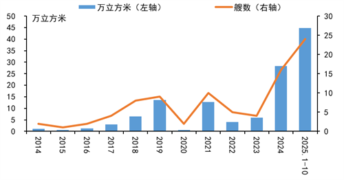 LNG運輸船訂單下滑源于出口項目決策有限、運費低迷與運力增長壓力。2025年,達成最終投資決定的LNG出口項目數量有限,直接抑制LNG運輸船的新造需求。且由于近兩年新船集中交付,市場運力過剩導致即期運費承壓,進一步抑制了新船訂單。2025年1-10月,16萬立方米、17.4萬立方米LNG運輸船的平均即期運費分別為16494、27886美元/天,分別同比下降65.5%、53.7%;一年期期租租金分別為19659、35182美元/天,分別同比下降67.3%、53.7%。