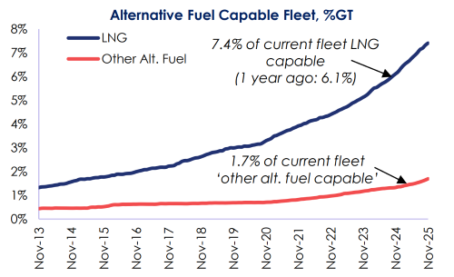 根據克拉克森的數據,整體而言按噸位計算,截至目前在運營船隊中能夠使用替代燃料或推進裝置船舶的比例已經提高到了9.1%,高于2017年的2.6%和2024年年初的6.5%。在現有總計2659艘替代燃料船舶中,包括1515艘LNG動力船、87艘甲醇動力船、148艘LPG動力船、773艘電池/混合動力推進船,此外還有296艘采用其他燃料。