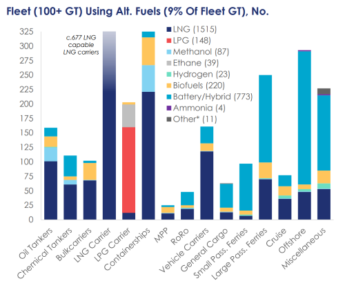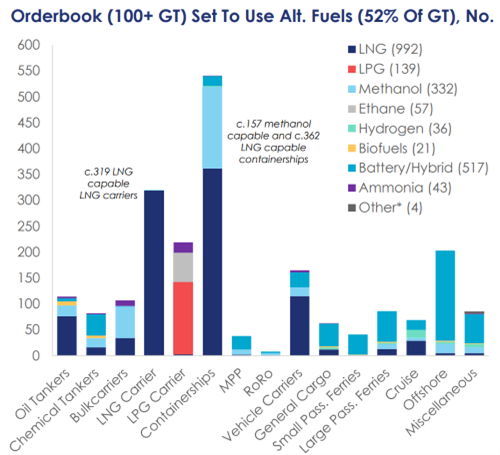 今年的替代燃料船舶訂單包括LNG動力船175艘2340萬總噸,甲醇動力船57艘620萬總噸,LPG動力船17艘70萬總噸,乙烷動力船4艘10萬總噸,以及電池/混合動力推進船舶112艘150萬總噸。
