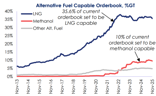 以船廠國而言,克拉克森的數據顯示,2025年10月的替代燃料新船訂單全部由中國船廠承接,總計10艘18.34萬CGT,其中LNG雙燃料船5艘10.41萬CGT、甲醇雙燃料船3艘6.4萬CGT、電池/混合動力船2艘1.54萬CGT。