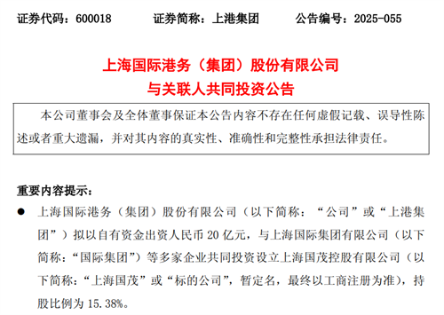 11月13日,上海國際港務(wù)(集團)股份有限公司(證券代碼:600018,證券簡稱:上港集團)發(fā)布公告,擬以自有資金出資人民幣 20 億元,與上海國際集團有限公司(以下簡稱:“國際集團”)等多家企業(yè)共同投資設(shè)立上海國茂控股有限公司(以下簡稱,“上海國茂”),持股比例為 15.38%。