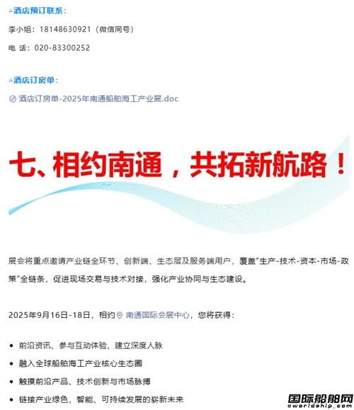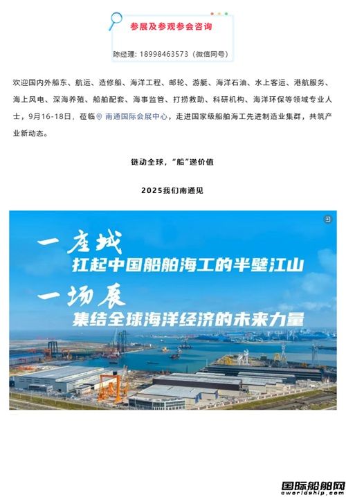 奔騰長江在此入海,黃金海岸在此舒展--南通,這座屹立于江海交匯之地的樞紐之城,正以萬億級產業基座為全球船舶海工繪制新航海圖!由南通市人民政府、中國船舶工業行業協會主辦的2025南通船舶海工產業展,將于9月16日-18日,在南通國際會展中心召開,誠邀全球同仁共赴世界級產業集群和驅動未來海洋經濟引擎的盛會。